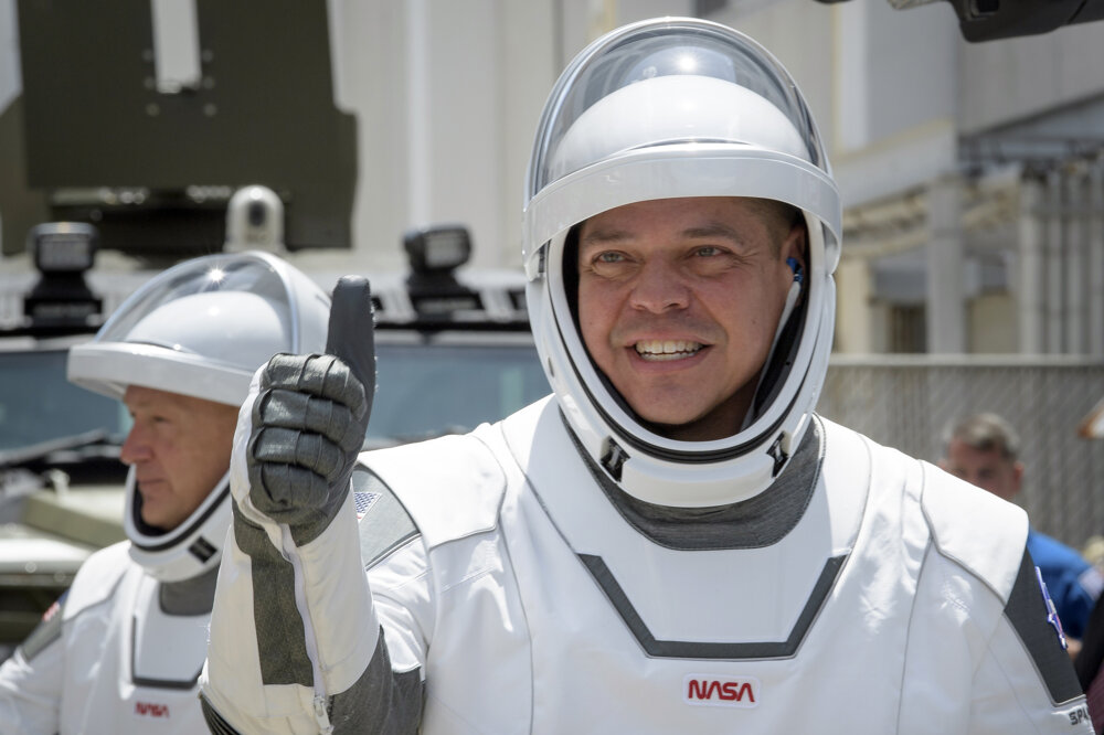 Astronauti Robert Behnken (pravo) a Douglas Hurley na ceste k rakete Falcon 9 pred druhým pokusom a odštartovanie misie SpaceX Demo-2,